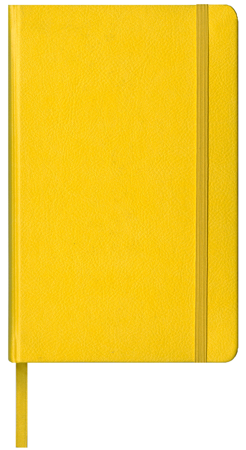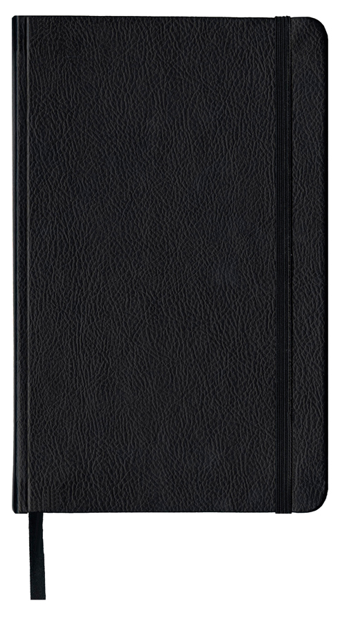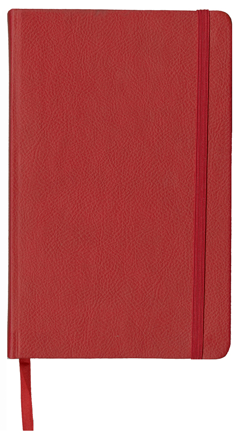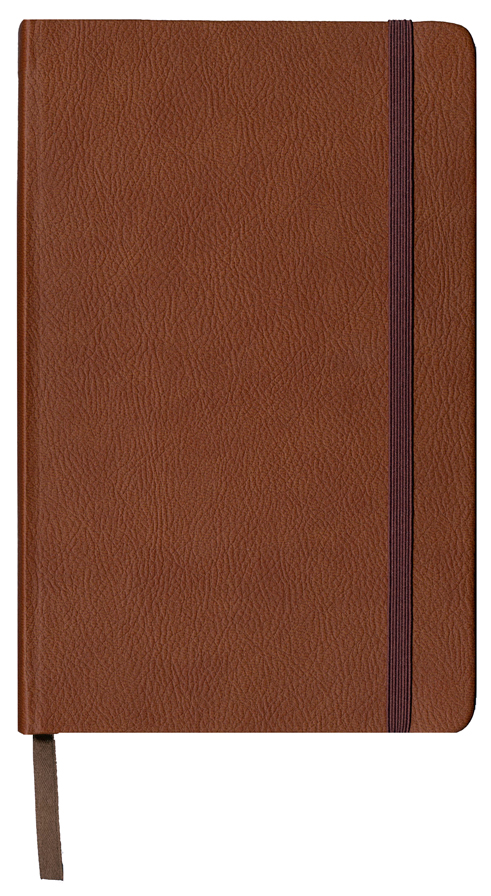 Hard cover lay-flat signature sewn reporter notebook with elastic band closure. Soft textured cover. Matching satin page marker ribbon. Includes 5" x 8", 192 ruled cream pages. Inside back cover has an expandable pocket. Colors: Black, Brown, Terracotta, Tan, Yellow, Royal Blue, Navy Blue, Teal, Dark Green, Gray, Red, Orange, Pink and Purple. Product Measurements: 5" x 8 1/8".